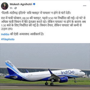 हिमाचल प्रदेश के उपमुख्यमंत्री मुकेश अग्निहोत्री इन दिनों निजी कार्यक्रम में व्यस्त हैं और इसी सिलसिले में दिल्ली गए हुए थे। यही कारण है कि इन दिनों धर्मशाला विधानसभा में चल रहे शीतकालीन सत्र में अभी तक हिस्सा नहीं सके। कार्यक्रम से निवृत होकर उपमुख्यमंत्री मुकेश अग्निहोत्री दिल्ली से शिमला के लिए हवाई जहाज से (चंडीगढ़ तक) रवाना हुए। फ्लाइट में 2 घंटे की देरी पर उपमुख्यमंत्री मुकेश अग्निहोत्री ने आव देखा और ना ताव तुरंत एक पोस्ट अपने सोशल मीडिया प्लेटफॉर्म पर पोस्ट कर दी।