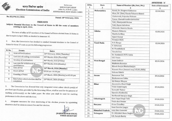 26 फरवरी को चुनाव के लिए अधिसूचना जारी की जाएगी। पांच मार्च नामांकन दाखिल करने की अंतिम तिथि है। छह मार्च को नामांकन पत्रों की जांच की जाएगी। नाम वापस लेने की अंतिम तिथि 9 मार्च है। राज्यसभा चुनाव के लिए मतदान 16 मार्च को होगा। केंद्रीय चुनाव आयोग पहले ही संबंधित राज्यों के मुख्य निर्वाचन अधिकारियों को रिटर्निंग अधिकारियों की नियुक्ति के निर्देश जारी कर चुका है।