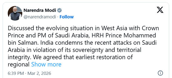 “सऊदी अरब के क्राउन प्रिंस और प्रधानमंत्री, महामहिम प्रिंस मोहम्मद बिन सलमान के साथ पश्चिम एशिया में बदलते हालात पर चर्चा की। भारत हाल ही में सऊदी अरब पर किए गए हमलों की निंदा करता है, जो उसकी संप्रभुता और क्षेत्रीय अखंडता का उल्लंघन है। हम इस बात पर सहमत हुए कि क्षेत्रीय शांति और स्थिरता की जल्द से जल्द बहाली सबसे अधिक ज़रूरी है। मैंने इन मुश्किल समय में भारतीय समुदाय की भलाई का ध्यान रखने के लिए उन्हें धन्यवाद दिया।”