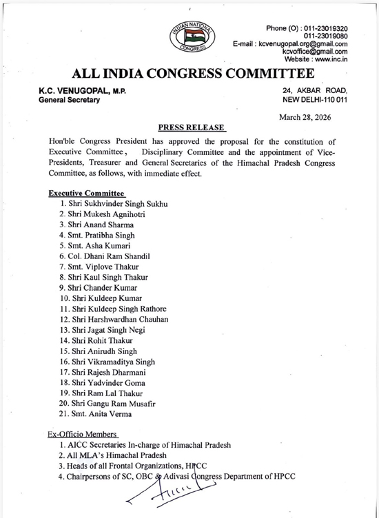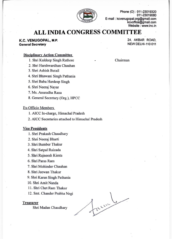 कांग्रेस अध्यक्ष ने हिमाचल प्रदेश कांग्रेस समिति की कार्यकारिणी समिति और अनुशासन समिति के गठन, तथा उपाध्यक्षों, कोषाध्यक्ष और महासचिवों की नियुक्ति के प्रस्ताव को तत्काल प्रभाव से, निम्नानुसार अनुमोदित कर दिया है।