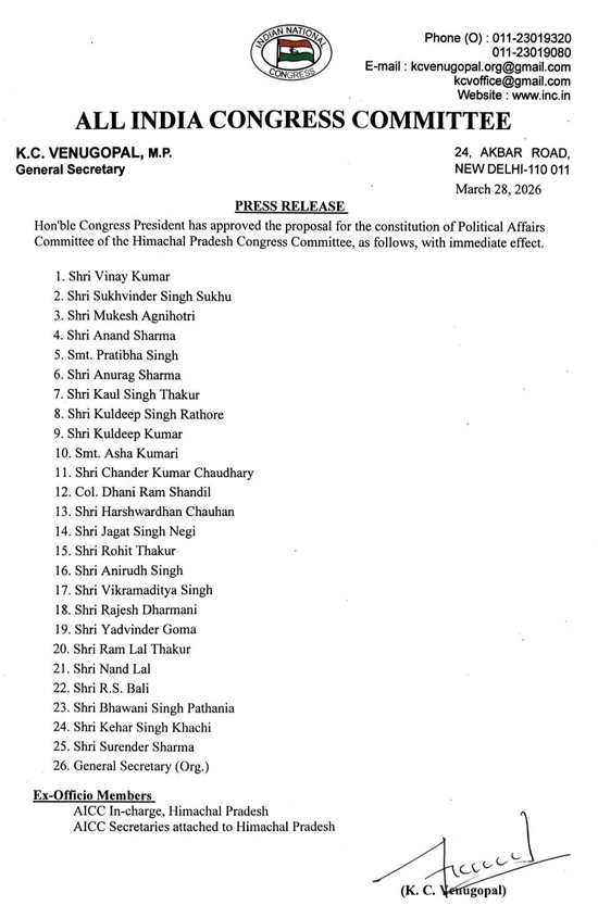 एआईसीसी सचिव हिमाचल प्रदेश से जुड़े भी पदेन सदस्य होंगे।